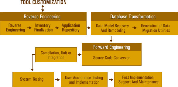 | The source codes of the programs from the existing applications are reverse engineered, renovated and then forward engineered to generate programs in the target database environment. |